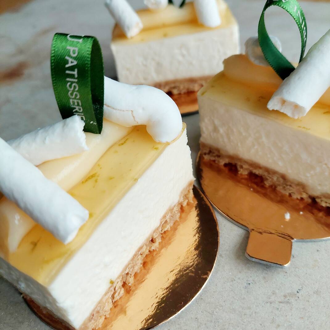 A buttery biscuit base, Lemon and Lime cheesecake topped with lemon curd and meringue pieces