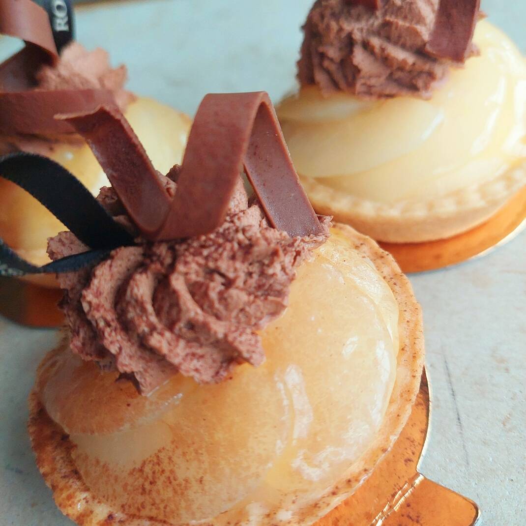 Crispy sweet pastry case filled with Vanilla Cream and poached pear slices, topped with Chocolate Ganache